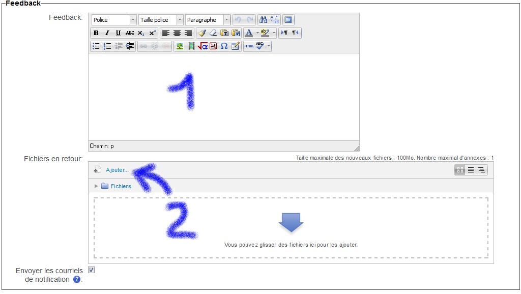 Si vous souhaitez rendre le devoir à l'élève après l'avoir complété, rayé, etc, vous pouvez le faire depuis votre logiciel ou en utiliser un spécifique, comme PDF-viewer qui permet d'écrire par dessus un PDF. Vous devrez ensuite enregistrer ce fichier corrigé sur votre ordinateur pour le rendre à l'élève en cliquant sur « Ajouter... » (2) : la procédure est ensuite la même que pour déposer un document. Bien évidemment, seul l'élève concerné pourra accéder à ce document. |