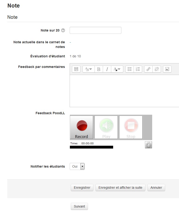 souhaitez maintenant évaluer vos élèves. Le mode d'évaluation (compétences, note sur 10, sur 20 ou sur 100...) est à déterminer depuis les paramètres de l'activité orale, même à posteriori : Après avoir activé le Mode édition, cliquer sur Modifier en face de l'activité : ![]() Choisir alors Paramètres : ![]() Dérouler, dans le bas de la page, la section Note : ![]() Dans cet exemple, 'élève obtiendra une note sur 20. Pour évaluer les élèves, il suffit maintenant de cliquer sur l'activité depuis la page d'accueil du cours, puis de cliquer sur « Consulter/évaluer tous les travaux remis » : ![]() La liste des devoirs rendus vous permet d'écouter directement les enregistrements des élèves : ![]() Pour évaluer un élève, il suffi de cliquer sur le petit picto de la colonne Note en face du nom de l'élève : ![]() Sur la page qui s'ouvre, vous pouvez indiquer la note, écrire un commentaire écrit et/ou enregistrer directement un commentaire oral, aussi simplement que les élèves : ![]() Chaque élève accèdera évidemment à sa note et à vos commentaires (feedback). Vous pourrez obtenir la liste des notes sous forme de tableau pour les saisir dans Pronote. N'hésitez pas à laisser des commentaires pour partager vos expériences... |